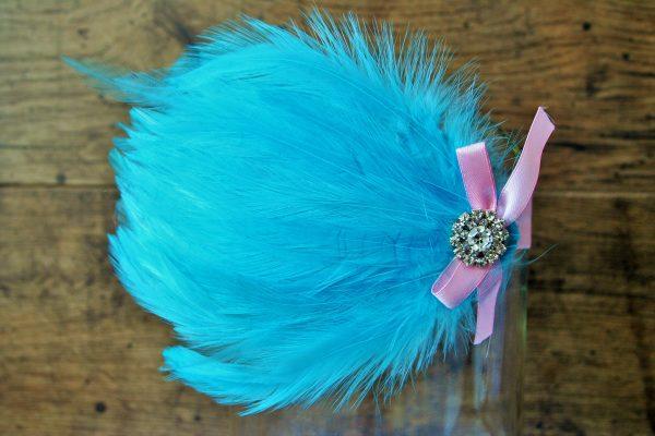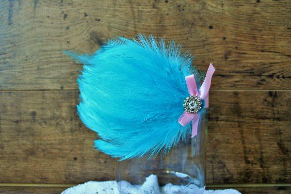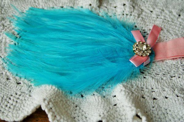 Türkiz kék színű tollas fejpánt kislányoknak babafotózáshoz, apró kövekkel és rózsaszín masnival díszítve. A termék fotózási kellék, hétköznapra nem ajánlott. A tollas díszek ragasztással kerültek a gumis pánton rögzítésre. Többféle hasonló fejpántot és kiegészítőt talál webshopunkban. Ha kérdése van a kapcsolatok menüben érdeklődhet.