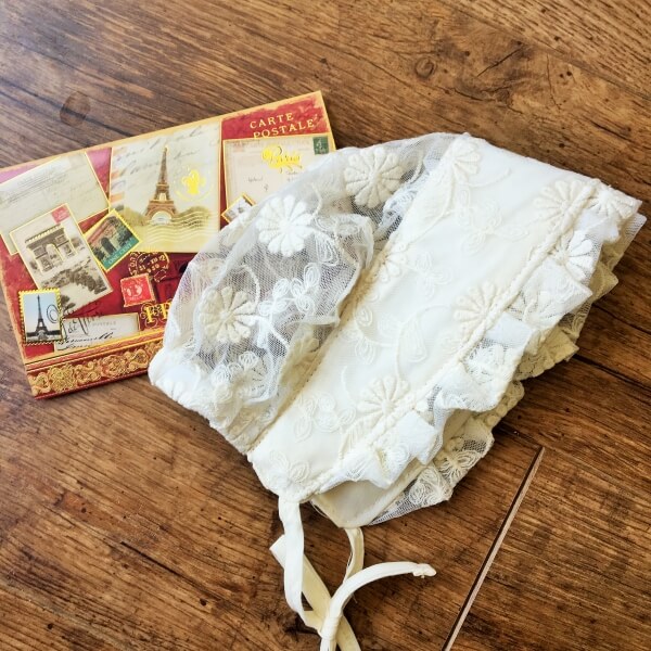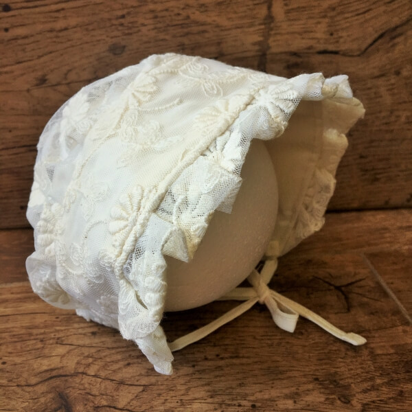 Törtfehér színű vintage stílusú csipkés sapka babáknak, amely apró hímzett virágokkal díszített. Rövid 21 cm-es megkötővel biztosíthatja a kalapot gyermeke fején. A félbehajtott sapka magassága 17,5 cm, mélysége 14 cm. Remek választás vintage babafotók készítéséhez vagy esküvőre, születésnapi viseletnek. 1-es típus nagy virágos, 2-es típus apróvirágos