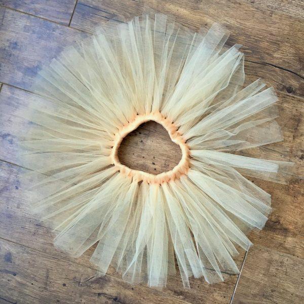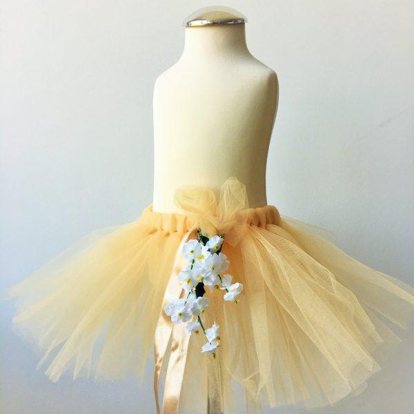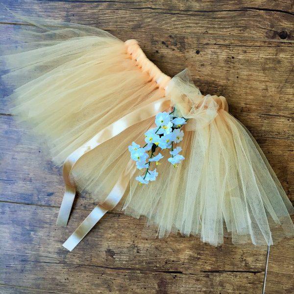 Kellemes karamell színű tütü szoknya születésnapi fotózáshoz, babafotózáshoz készült kiegészítő kellék, selyem szalaggal és fehér apróvirágos gumis karkötővel. A gumis karkötő használható önállóan vagy a szoknyához is lehet kötni a szalaggal. Webshopunkban talál többféle fehér vagy mintás felsőt is babák részére vagy a szetthez illő virágos vagy masnis pántokat.