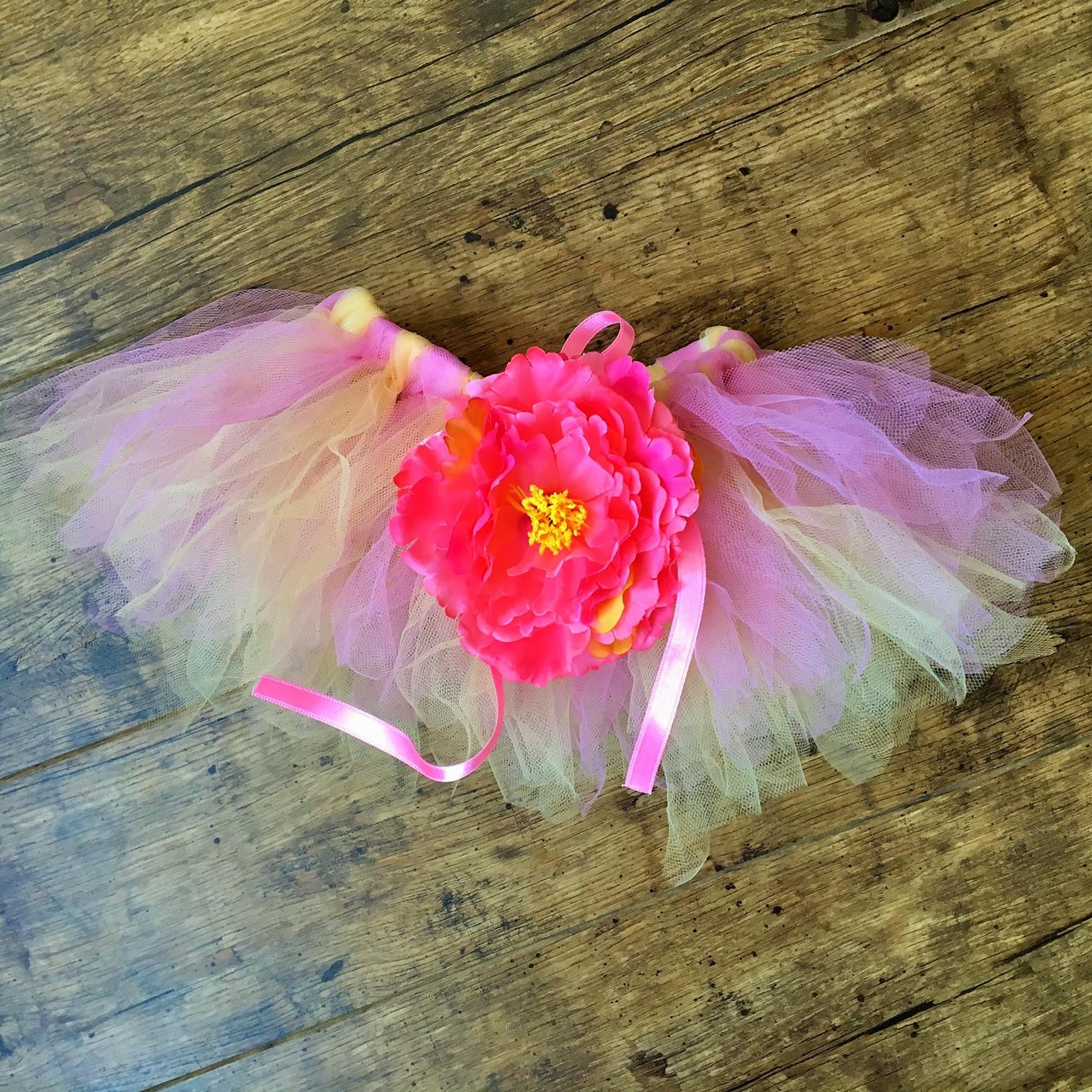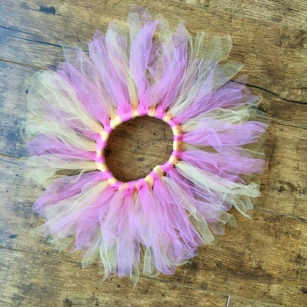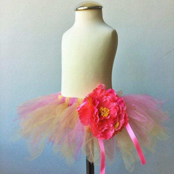 Újszülöttek részére készült tütü babafotózási kellék, remek választás a baba első fotózásához, színe kellemes tavaszi százszorszép hatását kelti. A púder rózsaszín és sárga színű tüll szoknya rózsaszín selyem szalaggal és bazsarózsa gumis karkötővel egészül ki. A karkötőt a szoknya derekához is rögzítheti a szalaggal. A szett fotózási kellék, mindennapi használatra nem ajánlott.