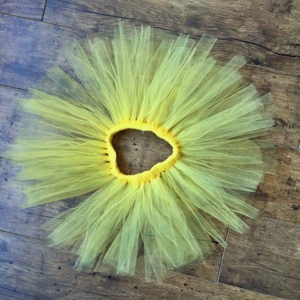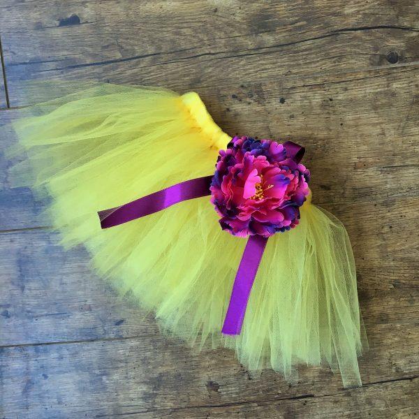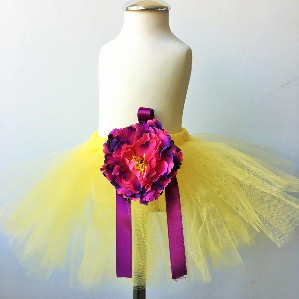 Sárga színű tütü szoknya lila selyem szalaggal és bazsarózsa gumis karkötővel. A karkötő szoknyához köthető díszként is funkcionálhat. A szett fotózási kellék, mindennapi használatra nem ajánlott. A szoknya tüll csíkokból készült csomózással, a dereka gumis. Lila vagy sárga színű kiegészítőket ajánlunk ehhez a szetthez, a fejpántokat, felsőket megtalálja áruházunkban.