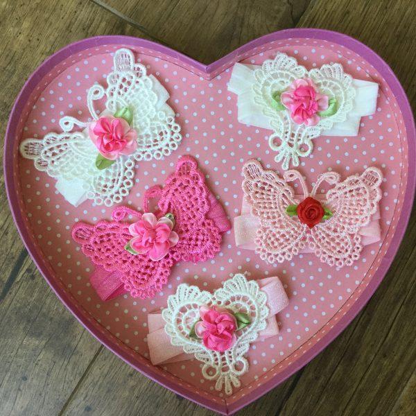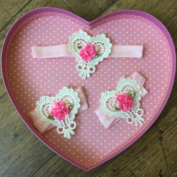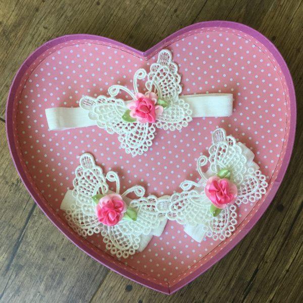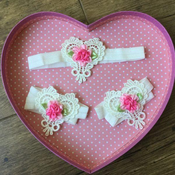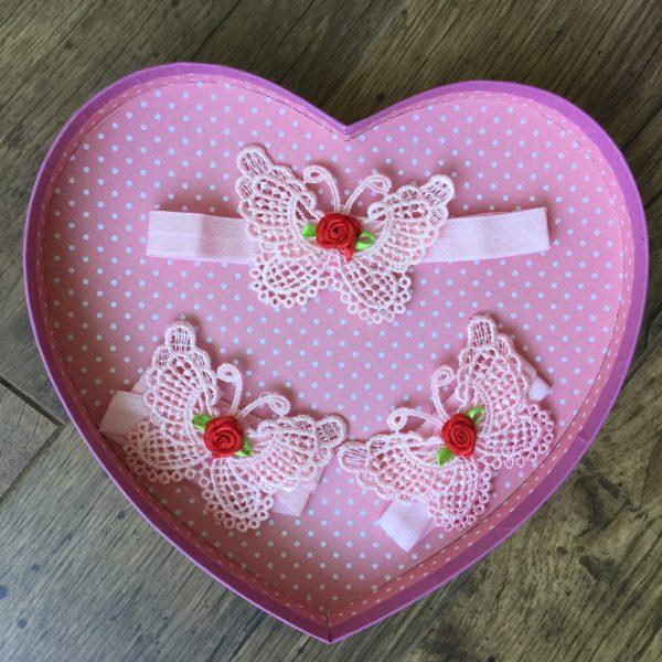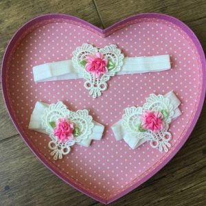 Többféle színben csipke szív és pillangó alakú fejpánt és szandál, 3 részes szett újszülötteknek babafotózáshoz kiegészítő. A pánt gumiból készült. Fotózáshoz, születésnapra ideális darab, de esküvőre is remek választás. A színválaszték alapján tegye a kosárba a kívánt szettet. Amennyiben a kívánt szín nincs készleten a rendelés feltételeiről kérem a kapcsolat menü alatt érdeklődjön.