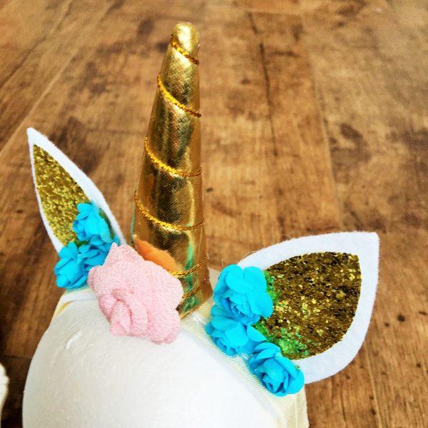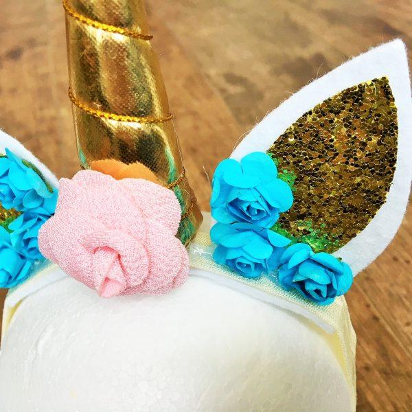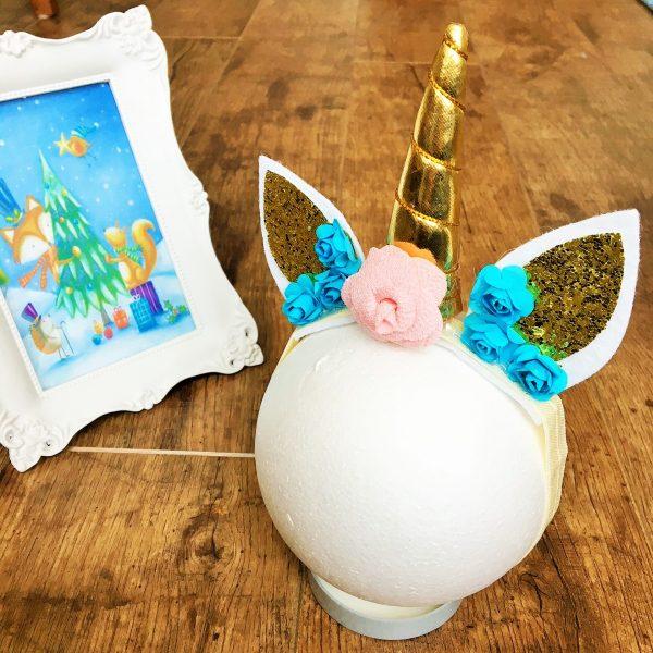 Ötletes unikornis fejpánt babáknak, kislányoknak fotózáshoz vagy farsangra. A fejpánt gumis részéhez ragasztással került rögzítésre az arany színű unikornis szarv és fülek valamint a kék és rózsaszínű virágok. A szarv rész puha tömőanyaggal került kitöltésre nem műanyag. Pontos méret a lenti további információk rovatban található. Amennyiben nincsen készleten vagy más színben, méretben szeretne rendelni kérem a kapcsolat menü alatt található űrlapon érdeklődjön.